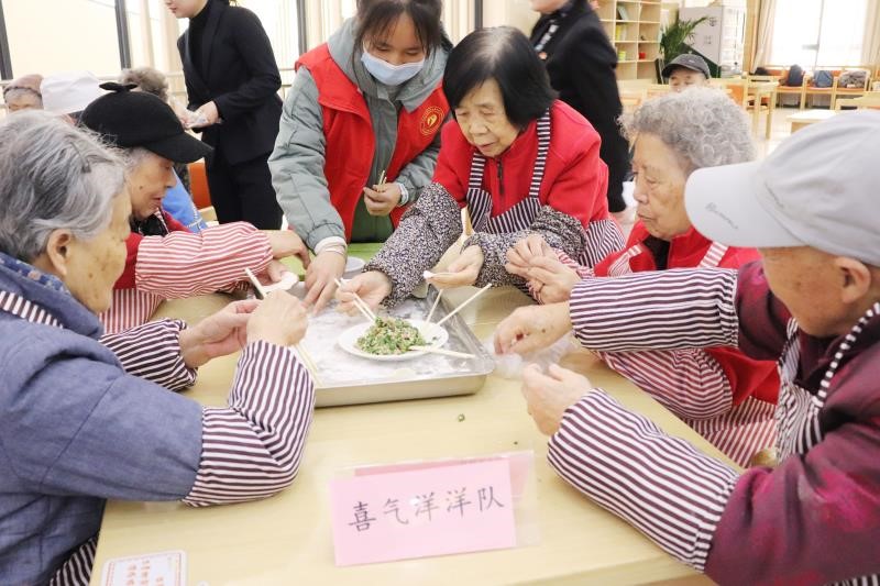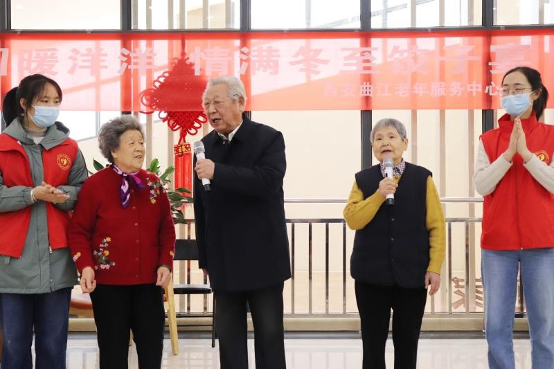 在曲江老年服务中心,志愿者们向老人们赠送了一些基本的生活用品,分发了写满祝福话语的明信片,并在随后和老人们一起合作包饺子、做游戏,温度在手掌之间传递,温暖在互动之中流淌。活动过程中,老人们和志愿者互相表演了各自精心准备的节目。老人们表演的经典曲目将志愿者带回了那个属于他们的时代,而志愿者的节目也将到场的老人们深深吸引。