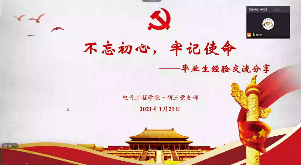 为帮助在校研究生了解毕业生就业去向,提高就业竞争力,解决求职存在的疑难,明确奋斗的目标方向。1月21日晚,电气工程学院研1814党支部与研1808党支部以“不忘初心,牢记使命--毕业生经验交流分享”为主题联合举办党日活动。活动以腾讯会议的方式进行,共有100多名研究生参加,会议由研1814班党支书张凡凡主持。