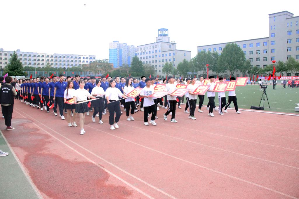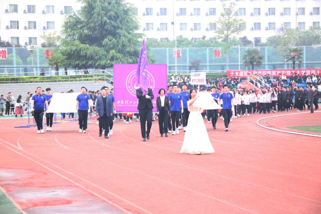 开幕式上,一个个方阵陆续入场,电气工程学院学生及教职工方阵作为第四个方阵入场,我院大一同学及教职工组成的两个方阵踏着整齐有力的步伐,激情轩昂,入场之时,鼓声起,“电气工程,众志成城,乘风破浪,扬帆远航”的口号声响破云霄!