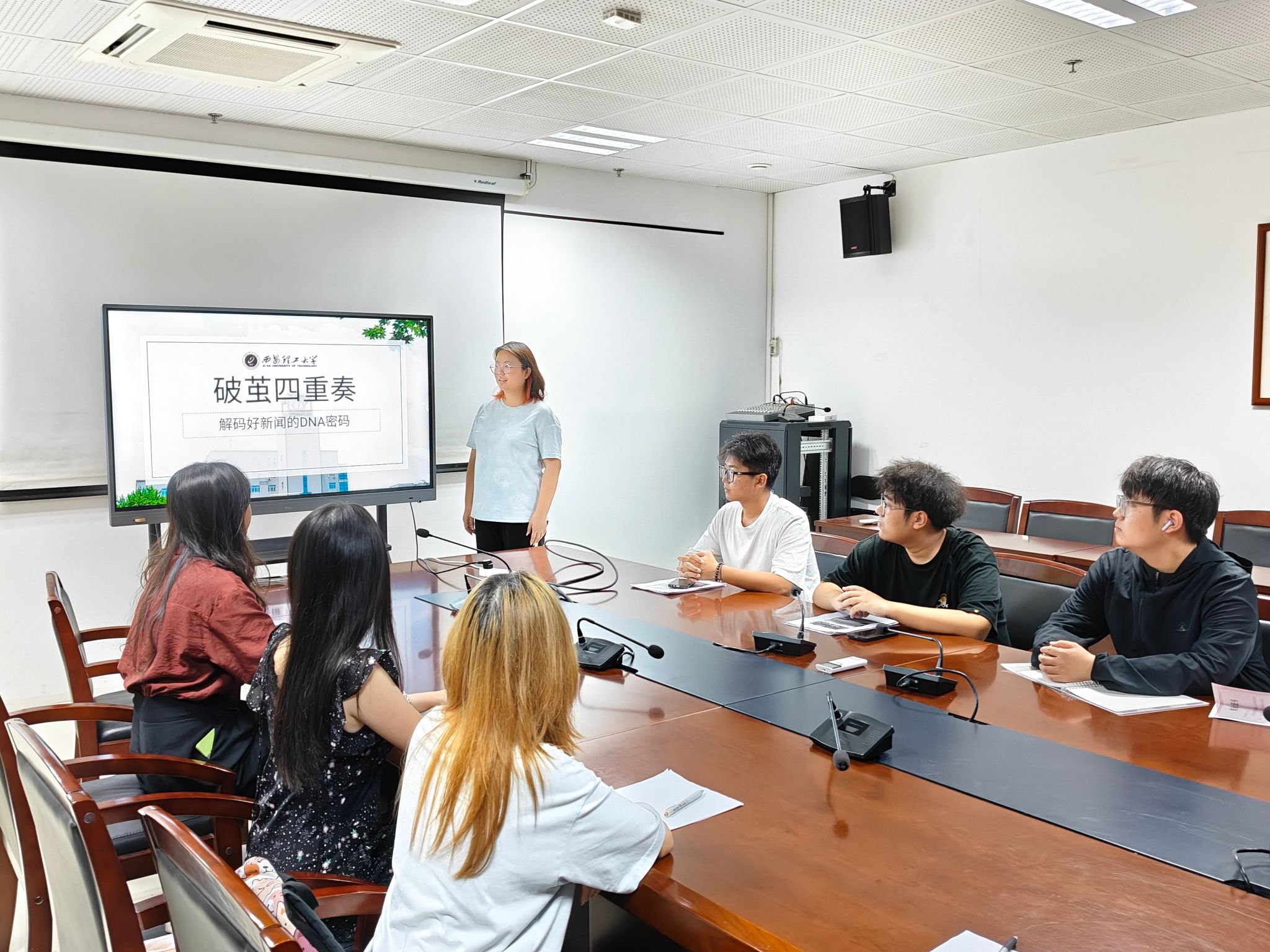讲座中,袁明霞以"解锁好新闻的DNA密码"为主题,分享了内容创作的核心理念与方法。她提出优质内容应具备五大DNA要素:时效性、接近性、显著性、趣味性和共鸣性。"我们要善于发现校园生活中的闪光点,用真情实感讲述有温度的故事。"她在分享中强调,好的内容不仅要注重形式美,更要体现思想深度和情感温度。陈小洁老师随后进行了补充指导,就如何将美育理念融入日常创作提出了专业建议。现场交流互动频繁,氛围浓厚。