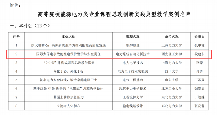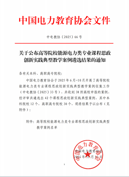11月18日,中国电力教育协会2025年度电力行业高等院校课程思政建设成果教学案例交流会在广西水利水电职业技术学院开幕,会议公布了电力行业高等院校电力类专业课程思政成果教学案例遴选结果。我院段建东、王建华、呼梦颖、路文超老师负责的“国际大停电事故的继电保护警示与安全责任——《电力系统自动化新技术》课程思政教学案例”成功入选。
