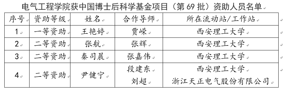 2021年6月9日,中国博士后科学基金会公布了第69批(2021年上半年)资助人员名单。电气工程学院4位青年教师位列其中,其中入选自然科学一等资助1人、二等资助3人,名单如下。