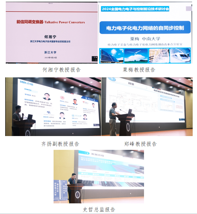 本次研讨会,浙江大学何湘宁教授作了题为“能信同调变换器-Talkative Power Converters”的报告;中南大学粟梅教授作了题为“电力电子化电力网络的自同步控制”的报告;西北工业大学齐扬副教授代替李伟林教授作了题为“航空多端口能量路由器设计与协同控制”的报告;西安电子科技大学郑峰教授作了题为“电机驱动系统的交直流双侧EMI抑制技术”的报告;陕西通合电子科技有限公司史哲技术总监作了题为“通合科技指向未来”的报告。精彩的前沿性学术报告引发现场专家学者们的热烈讨论与深入思考,现场学术争鸣,气氛活跃。