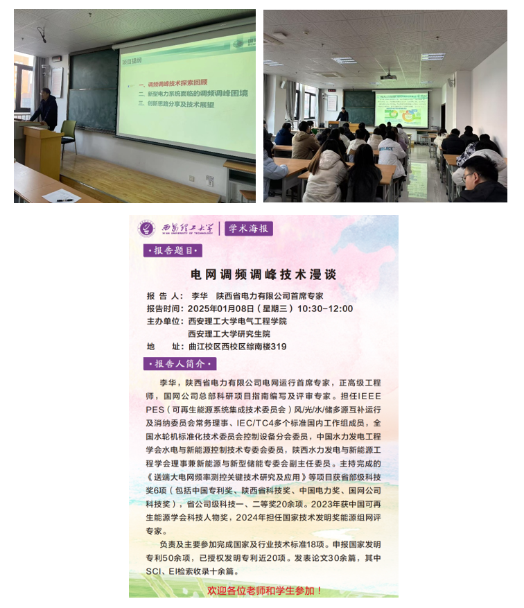 为促进与国网陕西省电力有限公司学术交流和合作,助力一流学科建设,电气工程学院与研究生院联合邀请了国网陕西省电力有限公司电网运行首席专家李华于2025年1月8日上午10:00在西安理工大学曲江校区西校区综南楼319室作了题为《电网调频调峰技术漫谈》的专题学术报告,电气工程学院青年老师和研究生听取了学术报告并做了深入交流,会议由电气工程学院副院长宋卫章教授主持。
